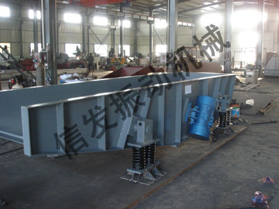 機器由箱體、振動電機、柵條排和彈簧減振裝置等四部分組成。箱體為一剛性結構,內測 與物料接為雙臺階式,間隙呈楔形以利徘料,柵條材質為耐磨高錳鋼。減振裝置采用優質螺旋 彈簧。